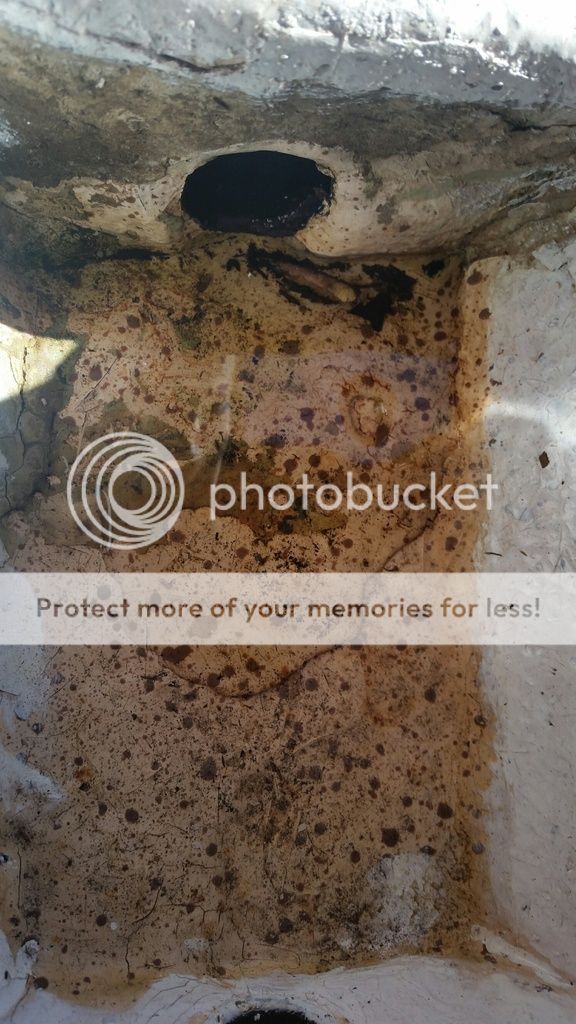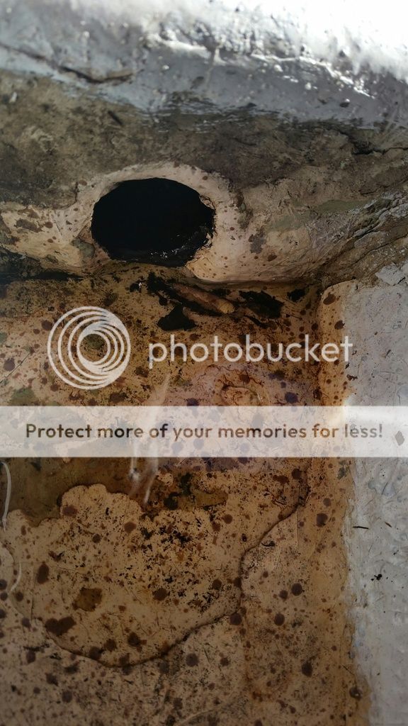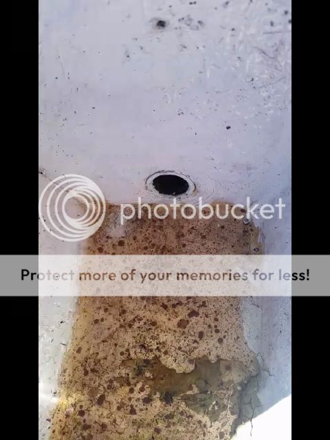 Showing the drain hole and opposite it the bilge hole, which appears to be little more than an unreinforced hole in the fiberglass. With a colonscope we might learn more.