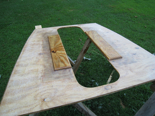 Not trusting my deck cutting skills, I decided to make some solid platforms for the edges of the deck to rest on. They are made from 2x4 bits cut at various angles (from 16-45 degrees) then poly'd and glassed to the hull. I wasn't too worried about making them perfectly waterproof, as they aren't crucial, just there to make me feel better and to add support until the deck is fully glassed in.